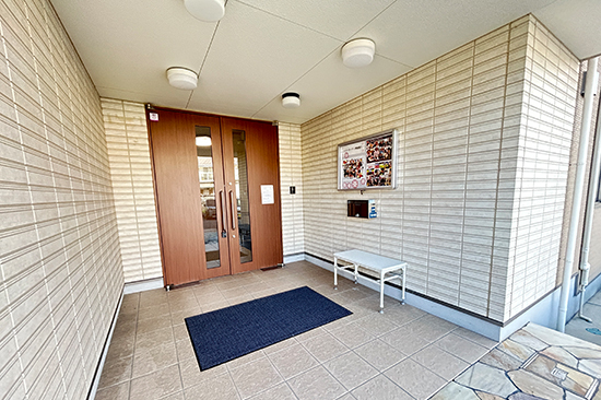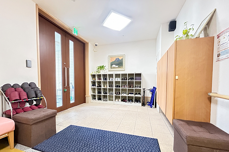 玄関は広々として明るく、開放感のある空間です。スツールが設置されており、履物の履き脱ぎも楽に行えます。段差のないバリアフリー仕様で、ご利用者さまはもちろん、介護する側の負担軽減にもつながっています。
