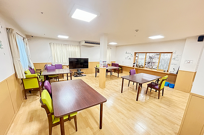 入居者の皆様が食事や談話などをする共用の多目的ルームです。大きな画面のテレビや大きめで座りやすいイスなど、細かな配慮が施されています。